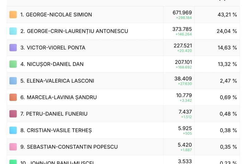 Rezultate alegeri prezidențiale 2025, turul 1. Biroul Electoral Central a început să publice primele rezultate oficiale parțiale ale alegerilor prezidențiale 2025. Acestea sunt actualizate în timp real, pe măsură ce procesele-verbale ajung din secțiile de votare.. Pe site-ul nostru, www.realitatea.net, puteți urmări LIVE UPDATE STATISTICA.
