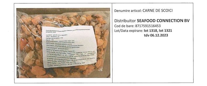 ”Vă informăm că fost notificați de către furnizorul SEAFOOD CONNECTION BV să inițiem retragerea de la comercializare și de la clienți a articolului menționat mai jos: