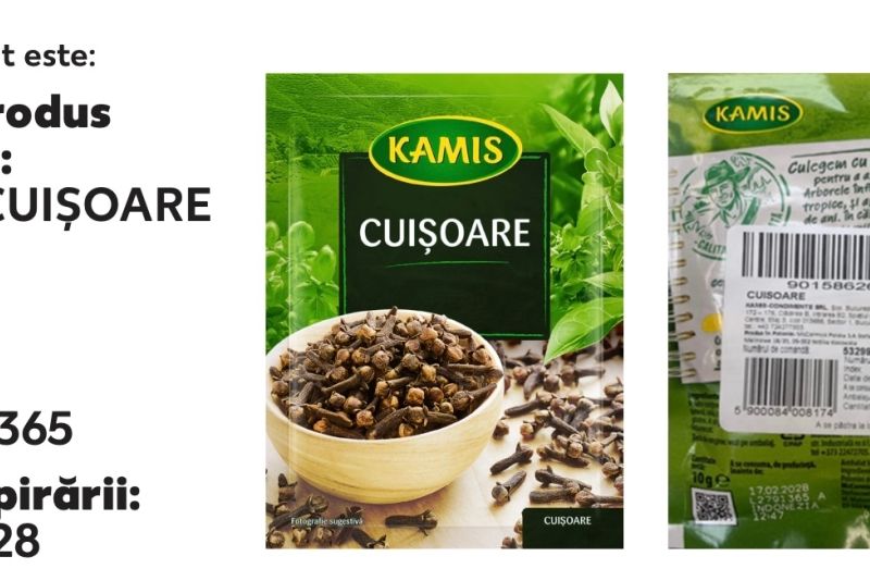 KAMIS Condimente SRL anunță că recheamă produsul Kamis plic cuișoare de 10 g, după ce au fost detectate niveluri neconforme ale unui compus chimic folosit în scopuri fitosanitare numit "clorpirifos".