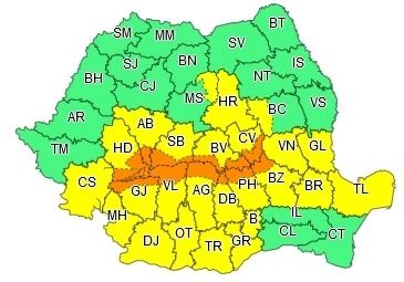 În Carpații Meridionali și de Curbură vor fi perioade cu averse torențiale și frecvente descărcări electrice. În intervale scurte de timp sau prin acumulare, cantitățile de apă vor depăși 40...60 l/mp.