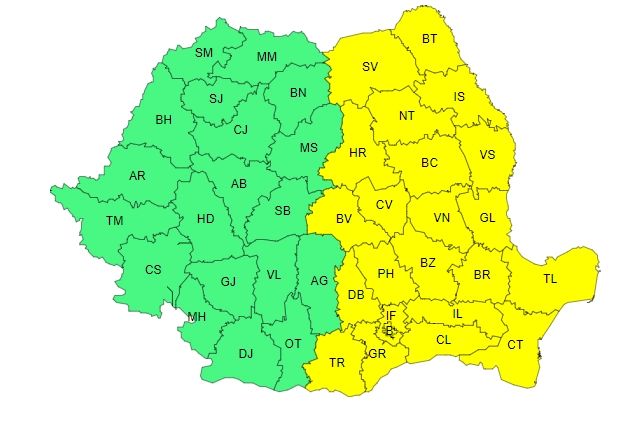 Administraţia Naţională de Meteorologie (ANM) a emis, sâmbătă, o nouă atenţionare Cod galben de averse, valabilă până duminică la prânz în jumătate din ţară, precum o informare de ploi moderate cantitativ, ce vizează toate regiunile, până luni dimineaţa.
