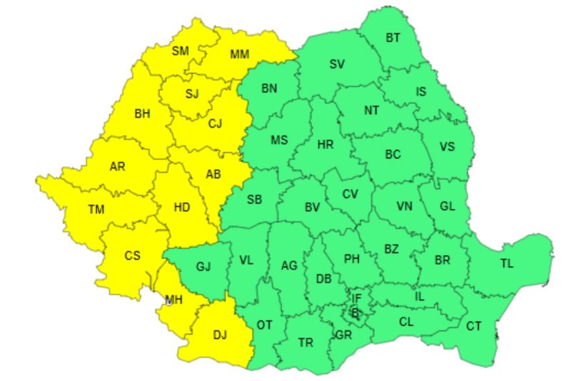 Meteorologii au emis, marți, o nouă avertizare cod galben de caniculă, valabilă, miercuri, în intervalul 12.00 – 21.00, în Maramureş, Crişana, Banat, vestul Transilvaniei şi sud-vestul Olteniei.
