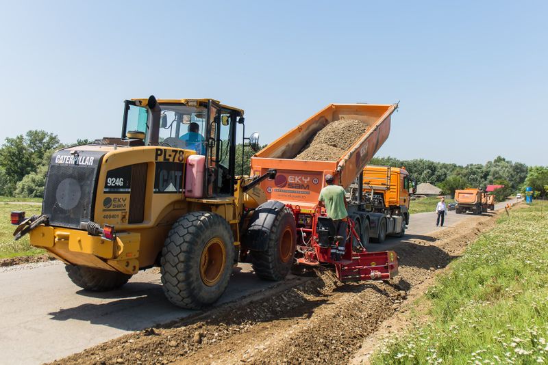 Pe drumul județean 207 M intersecție DN 28 - Al.I. Cuza, lucrătorii pregătesc casetele de lărgire a șoselei, acestea fiind stabilizate cu balast și ciment.
