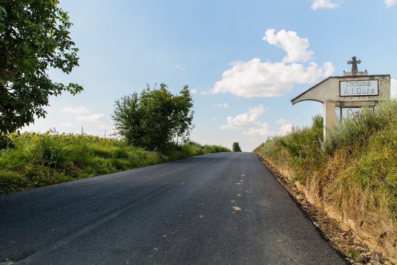Pe drumul județean 207 M, intersecție DN 28 - Al.I. Cuza, constructorul lucrează la turnarea primului strat de asfalt la Șcheia.