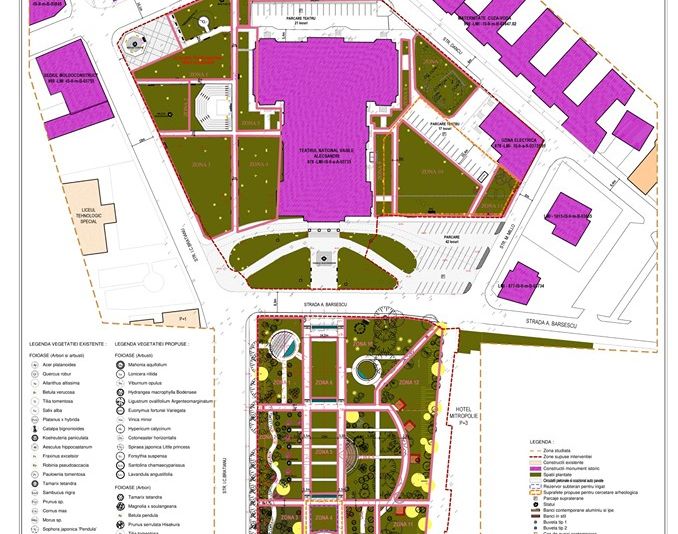 Toată vegetația înaltă va fi păstrată, mă refer aici atât la aliniamentele de platani dinspre strada I.C. Brătianu, cât și dinspre hotelul Mitropoliei. Singurele intervenții se vor face asupra vegetației joase, dominată de tuia și buxus.