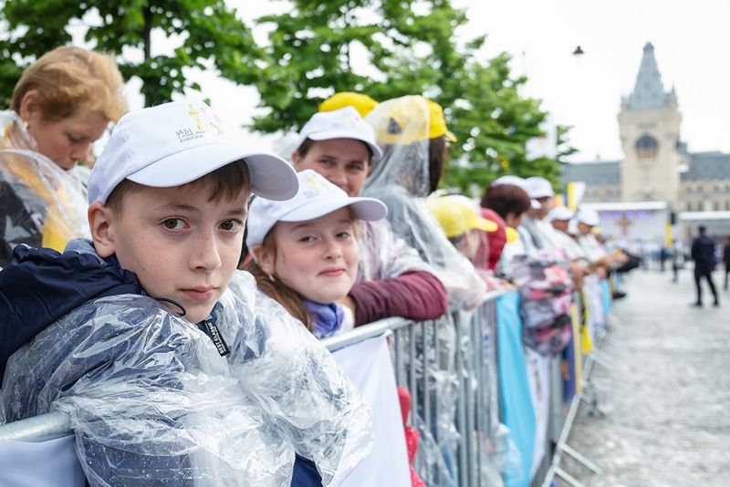 În faţa scenei de la Palatul Culturii, Papa Francisc a fost întâmpinat de copii, care l-au însoţit către scenă.Ulterior, Suveranul Pontif a fost salutat cu bucurie de către reprezentanţii Bisericii, iar un cor de 200 de tineri au cântat "Hristos a înviat!"Mai mult, o femeie din judeţul Iaşi, Elisabeta, care, împreună cu soţul ei, Ioan, are 11 copii, i-a mulţumit, într-un scurt discurs, Papei Francisc, pentru venirea în Capitala Moldovei.Apoi, corul format din cei 200 de tineri a cântat un imn special scris pentru eveniment, ce conţine şi îndemnul "Să mergem împreună!"De remarcat este faptul că, după câteva ore de ploaie, la Iaşi a ieşit soarele în momentul în care Papa Francisc a ajuns în inima târgului celor şapte coline.