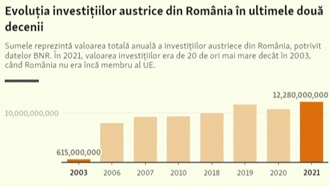 Iar Austria se află pe locul 3 într-un top al țărilor care investesc în întreprinderile din România. Pe primul loc sunt Țările de Jos, cu 22,1% din soldul total al investițiilor. Germania și Austria sunt aproape la egalitate, cu peste 12% fiecare.