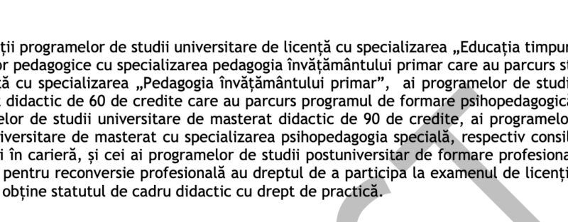 Art. 107 – „Absolvenții programelor de studii universitare de licență cu specializarea „Educația timpurie”, ai liceelor pedagogice cu specializarea pedagogia învățământului primar care au parcurs studii de licență cu specializarea „Pedagogia învățământului primar”, ai programelor de studii de masterat didactic de 60 de credite care au parcurs programul de formare psihopedagogică, ai programelor de studii universitare de masterat didactic de 90 de credite, ai programelor de studii universitare de masterat cu specializarea psihopedagogia specială, respectiv consiliere școlară și în carieră, și cei ai programelor de studii postuniversitar de formare profesională a adulților pentru reconversie profesională au dreptul de a participa la examenul de licențiere, pentru a obține statutul de cadru didactic cu drept de practică.” scrie edupedu.ro