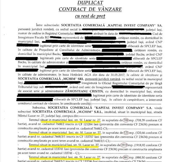 În acest contract de vânzare-cumpărare, se arată cum firma M.CHIM a achiziționat o suprafață de teren de 3600 mp pe str. Sf. Lazăr nr. 27 la prețul de 840 euro/mp. Acest teren este la o distanță foarte apropiată de terenul Municipalității de pe str. Zimbrului (în spatele Facultății de Textile și Pielărie) în suprafață de 5570 mp. Acest teren este unul dintre cele care au făcut obiectul schimbului între municipalitate și firma M.CHIM propus de primarul Mihai Chirica și care a fost evaluat de Primăria Iași cu 231 euro/mp.„Acest contract de vînzare-cumpărare este dovada clară că ni se pregătea un tun de proporții cu patrimoniul orașului. Dacă acest schimb propus de domnul Chirica s-ar fi concretizat, Iașul ar fi fost prejudiciat cu 3.550.000 euro doar pentru că terenul deținut de Primărie de pe str. Zimbrului, în spatele Facultății de Textile și Pielărie, a fost subevaluat grosolan. Asta pe lângă faptul că am fi cedat din patrimoniul orașului și alte suprafețe foarte valoroase, în zone bune ale orașului, Municipalitatea primind, în schimb, 6500 mp lângă Teatrul Național „Vasile Alecsandri” care nu puteau fi valorificați din cauza restricțiilor de construcție din zonă. Prin insistența noastră, a Opoziției PNL din Consiliul Local, și cu sprijinul presei care a mediatizat cazul, am reușit să oprim, pentru moment, acest „tun”. Din păcate, există o rețea mafiotă foarte bine structurată în zona imobiliarelor în special, în care instituțiile au devenit captive, în care și cei ce autorizează si cei ce verifică respectarea autorizațiilor sunt parte a acestei rețele. Prin devoalarea acestui ”tun”, i-am făcut un mare bine primarului Chirica. Dacă schimbul de terenuri s-ar fi concretizat și arătam după acest contract, primarul Iașului era într-o mare culpă. Acest document face parte dintr-o „valiză” de alte documente despre activitatea la limita legii a primarului”, a spus Marius Bodea, deputat PNL Iași.