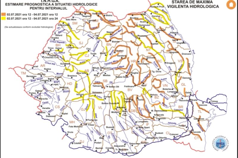 În intervalul 02.07.2021 ora 12:00 – 04.07.2021 ora 12:00 pe râurile din bazinele hidrografice: Vișeu, Iza, Lăpuş (judeţul Maramureș), Tur (judeţul Satu Mare), Someșul Mare – bazin superior și afluenți bazin mijlociu și inferior (judeţul Bistrița Năsăud), Mureș – bazin superior amonte S.H. Glodeni, Niraj (judeţele: Harghita şi Mureș), Târnava Micӑ – bazin superior şi afluenţi bazin mijlociu şi inferior, Târnava Mare – bazin superior şi afluenţi bazin mijlociu şi inferior (judeţele: Harghita, Mureş, Sibiu, Braşov şi Alba), Olt – bazin superior amonte S.H. Hoghiz şi afluenţii aferenţi sectorului aval S.H. Hoghiz – amonte confluenţă cu râul Lotru (judeţele: Harghita, Covasna, Braşov, Sibiu şi Vâlcea), Ialomiţa – bazin superior şi afluenţi bazin mijlociu şi inferior (judeţele: Dâmboviţa, Prahova, Ialomiţa şi Ilfov), Buzӑu – afluenţii aferenţi sectorului aval Ac. Siriu (judeţele: Covasna, Buzău şi Prahova), Rm. Sărat – bazin superior şi afluenţi bazin mijlociu şi inferior (judeţele: Buzău şi Vrancea), Putna – bazin superior şi afluenţi bazin mijlociu şi inferior (judeţul Vrancea), Trotuș – bazin superior și afluenți bazin mijlociu și inferior (judeţele: Harghita, Neamț, Bacău și Vrancea), Bistriţa – bazin superior şi afluenţi bazin mijlociu şi inferior (judeţele: Suceava, Neamț, Harghita şi Bacău), Moldova – bazin superior și afluenți bazin mijlociu și inferior (judeţele: Suceava şi Neamţ), Suceava – bazin superior și afluenți bazin mijlociu și inferior (judeţul Suceava), Bârlad – bazin amonte S.H. Vaslui şi afluenţii aferenţi sectorului aval S.H. Vaslui (judeţele: Neamţ, Iaşi, Vaslui, Bacău, Vrancea şi Galaţi), Siret – afluenţii mici aferenţi sectorului aval confluenţӑ cu râul Rm. Sӑrat (judeţul Galaţi), Bahlui (judeţul Iaşi), Prut – afluenţii aferenţi sectorului aval S.H. Drânceni (judeţele: Vaslui şi Galaţi) şi râurile din Dobrogea (judeţele: Constanţa şi Tulcea).