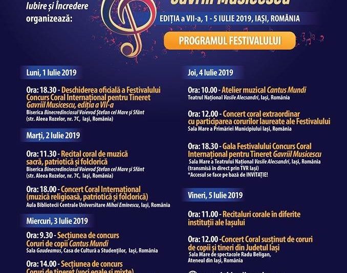 În perioada 1 – 5 iulie are loc cea de a șaptea ediție a Festivalului – Concurs Coral Internațional pentru Tineret Gavriil Musicescu, organizată de către Asociația Iubire și Încredere Iași.