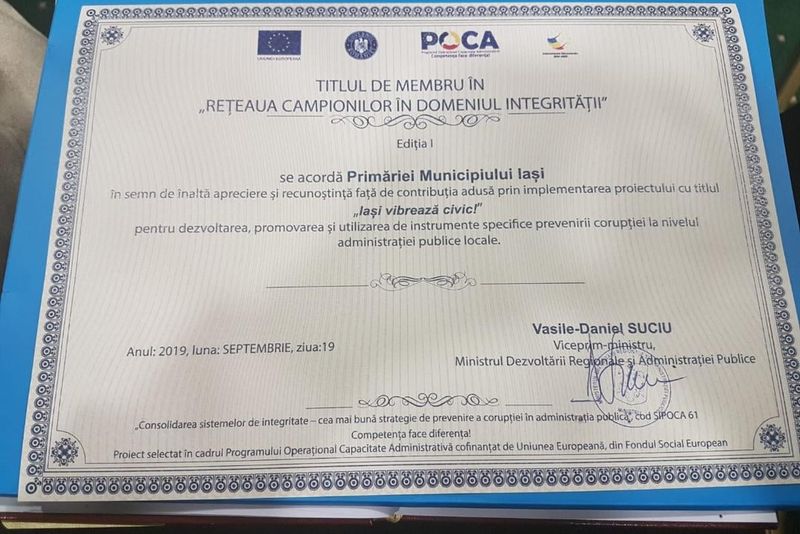 De asemenea, în cadrul aceleiaşi competiţii, municipalitatea ieşeană a obținut şi locul al III-lea la capitolul „Popularitate”.„Reţeaua Campionilor în domeniul integrităţii” a fost lansată de către MDRAP pe data de 1 iulie 2019 la nivelul administraţiei publice locale, ca activitate a proiectului „Consolidarea sistemelor de integritate – cea mai bună strategie de prevenire a corupţiei în administraţia publică”.Iniţiativa MDRAP a fost susţinută de Secretariatul General al Guvernului, Ministerul Justiţiei, Agenţia Naţională a Funcţionarilor Publici, Institutul Naţional de Administraţie şi Agenţia Naţională de Integritate, instituţii cu care în ultimii șase ani MDRAP, prin Direcţia integritate, Bună guvernare şi Politici publice a colaborat în domeniul integrităţii şi al bunei guvernări.