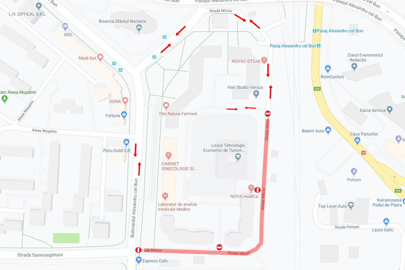 În perioada menționată traficul rutier pe această stradă va fi oprit, iar autovehiculele vor putea circula pe rutele marcate în schița atașată.În timpul lucrărilor pe strada respectivă va fi asigurat accesul mașinilor de intervenție ale Ambulanței, Poliției, Jandarmeriei și Inspectoratului pentru Situații de Urgență.