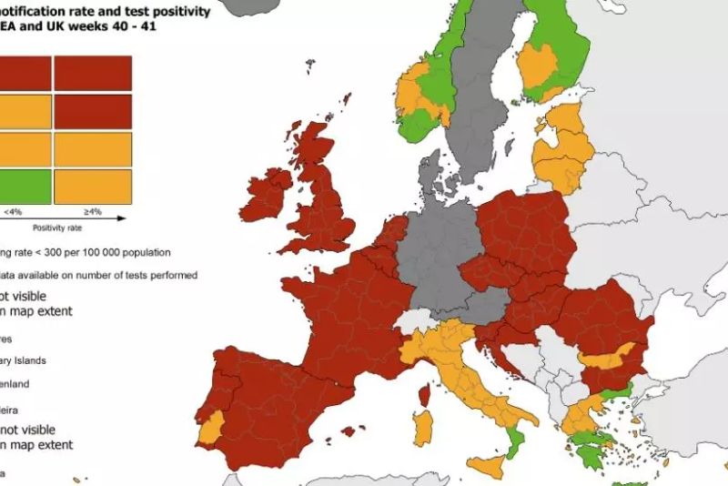 Mai mult de jumătate din ţările Uniunii Europene (UE), împreună cu Regatul Unit, sunt marcate cu roşu pe noua hartă europeană cu restricţiile de călătorie, publicată joi de Centrul European de Prevenire şi Control al Bolilor (ECDC). Este vorba de 17 țări, printre care și România, din totalul celor 27 de state membre. Miniştrii de Externe din cele 27 de ţări UE au convenit deja să pună în aplicare un sistem comun de cartografiere pentru a defini zonele de risc - a rezultat astfel un cod de culori de la verde (sigur) la roșu (risc ridicat).