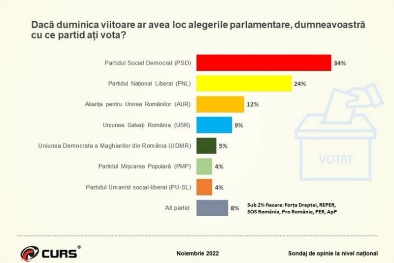 Un sondaj CURS realizat la nivel național în perioada 8-22 noiembrie 2022 vine cu cifre care răstoarnă calculele politice de până acum. Iată cum ar vota alegătorii dacă duminica viitoare ar avea loc alegeri parlamentare.