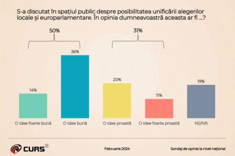 Institutul de sondare CURS a efectuat un sondaj de opinie pe populația adultă rezidentă din România, pe 1067 de respondenți cu vârste de peste 18 ani. În ceea ce privește comasarea alegerilor locale cu cele europarlamentare, un procent de 14% spune că ideea este foarte bună, iar 36% spune că ideea este bună.