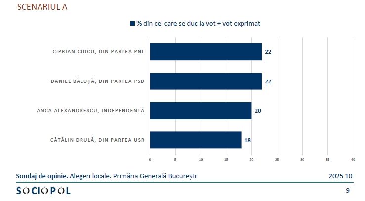 Potrivit datelor, candidata Anca Alexandrescu se apropie semnificativ de fruntea clasamentului, fiind la o diferență extrem de mică, de doar un procent, față de candidații Daniel Băluță și Cătălin Drulă. Rezultatul indică o cursă mult mai strânsă și mai imprevizibilă decât se anticipa.