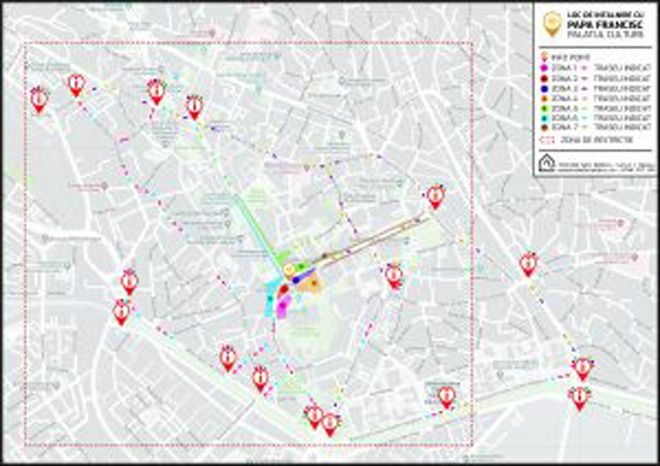 Astfel va fi interzis accesul pe: Gării, Arcu, Petru Movilă, Săulescu, Lozonschi, Sf. Andrei (de la Petrom), Ipsilanti, Trei Ierarhi, Splaiurilor (zona bld. Cantemir, str. Ipsilanti şi zona Podului de Piatră), D. Mangeron (până la bld. Tudor Vladimirescu), Elena Doamna (pe stradă şi la intersecţiile cu Smârdan, Otilia Cazimir, Ghica Vodă, A. Panu, Bărboi), Cuza Vodă (inclusiv la intersecţiile cu I.C. Brătianu, Cucu, Armeană, Dancu, Vasile Alecsandri), Gh. Ghibănescu şi Gavriil Muzicescu (până la Piaţa Mihai Eminescu).Locuitorii care stau în zona centrală, şi nu numai, trebuie să ţină cont de recomandarea Primăriei Iaşi de a nu-şi parca vehiculele pe următorul traseu: Palatul Culturii - Teatrul Luceafărul - strada Grigore Ureche până la strada Sfântul Lazăr (începând de astăzi şi până mâine la ora 21.00).Municipalitatea va permite parcarea autocarelor şi microbuzelor pelerinilor pe Splaiuri, şos. Moara de Foc, străzile Străpungerea Silvestru, Canta şi Silvestru, precum şi pe bulevardele Tudor Vladimirescu, Socola, C.A. Rosetti şi Nicolae Iorga.În acelaşi timp, parcările publice din zona centrală vor fi eliberate începând de astăzi. De asemenea, autorităţile au interzis parcarea pe mai multe străzi care sunt pe traseul pe care va ajunge Papa Francisc de la Aeroport şi până la Episcopia Romano-Catolică.Ieşenii şi pelerinii vor avea la dispoziţie mai multe puncte de informare amplasate în diverse zone ale oraşului, în special pe traseele stabilite pentru accesul în zonele delimitate de lângă Palatul Culturii.În cazul în care se înregistrează un volum mare de trafic auto şi pietonal, poliţiştii rutieri au undă verde să dispună, punctual, închiderea altor artere.
