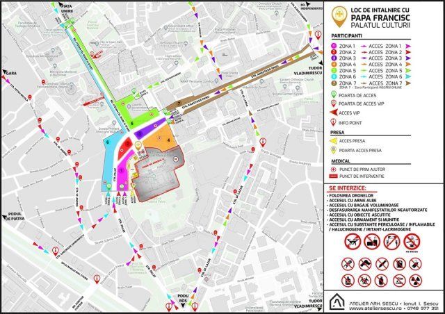 La acestea se adaugă o zonă VIP, dedicată invitaților speciali ai Primăriei și ai Episcopiei. O a opta zonă va fi cea din perimetrul catedralei catolice, cu un regim special, pentru bolnavi şi persoane în vârstă. Aici se va ajunge de pe strada Colonel Langa, cu permisele speciale primite anterior.Așezarea în perimetrul securizat al întâlnirii cu Papa Francisc: în Zona 1 va fi Decanatul de Vrancea, în Zonele 2 și 3 vor fi tinerii, în Zona 6 vor fi Decanatele de Iași și Valea Siretului, în Zona 5 vor fi celelalte decanate, în Zona 7 vor fi cei înscriși online. Unii preoți vor fi cu comunitățile lor, iar o parte cu invitații. Persoanele consacrate, seminariștii, profesorii laici, medici etc. vor fi în Zona 4.În toate aceste zone se va putea pătrunde începând cu ora 11.00, doar cu permisele de acces şi cu un act de identitate:- în Zona 1 se va intra prin porțile de acces de pe str. Palat (dinspre Podu Roș);- în Zona 2 se va intra prin porțile de acces de pe str. Palat (dinspre Podu Roș);- în Zona 3 se va intra prin porțile de acces de pe str. Anastasie Panu (Moldova Mall);- în Zona 4 se va intra prin porțile de acces de pe str. Anastasie Panu (Moldova Mall);- în Zona 5 se va intra prin porțile de acces de pe bd. Ștefan cel Mare și Sfânt (dinspre Piața Unirii), de pe str. Costache Negri și de pe str. Anastasie Panu (Moldova Mall);- în Zona 6 se va intra prin porțile de acces de pe bd. Ștefan cel Mare și Sfânt (dinspre Piața Unirii) și de pe str. Palat (dinspre Podu Roș);- în Zona 7 (zona participanților înscriși online), se va intra prin porțile de acces de la intersecția str. Elena Doamna cu str. Anastasie Panu.Toţi cei care vor intra în aceste zone vor trece printr-un control de securitate specific.La ora 16.00 se vor închide porţile de acces în perimetrul securizat. E important să se aibă în vedere că va fi nevoie de mai mult timp pentru a ajunge în zona întâlnirii cu Papa, deoarece se va circula mult mai greu până la Iaşi, dar şi în oraş.